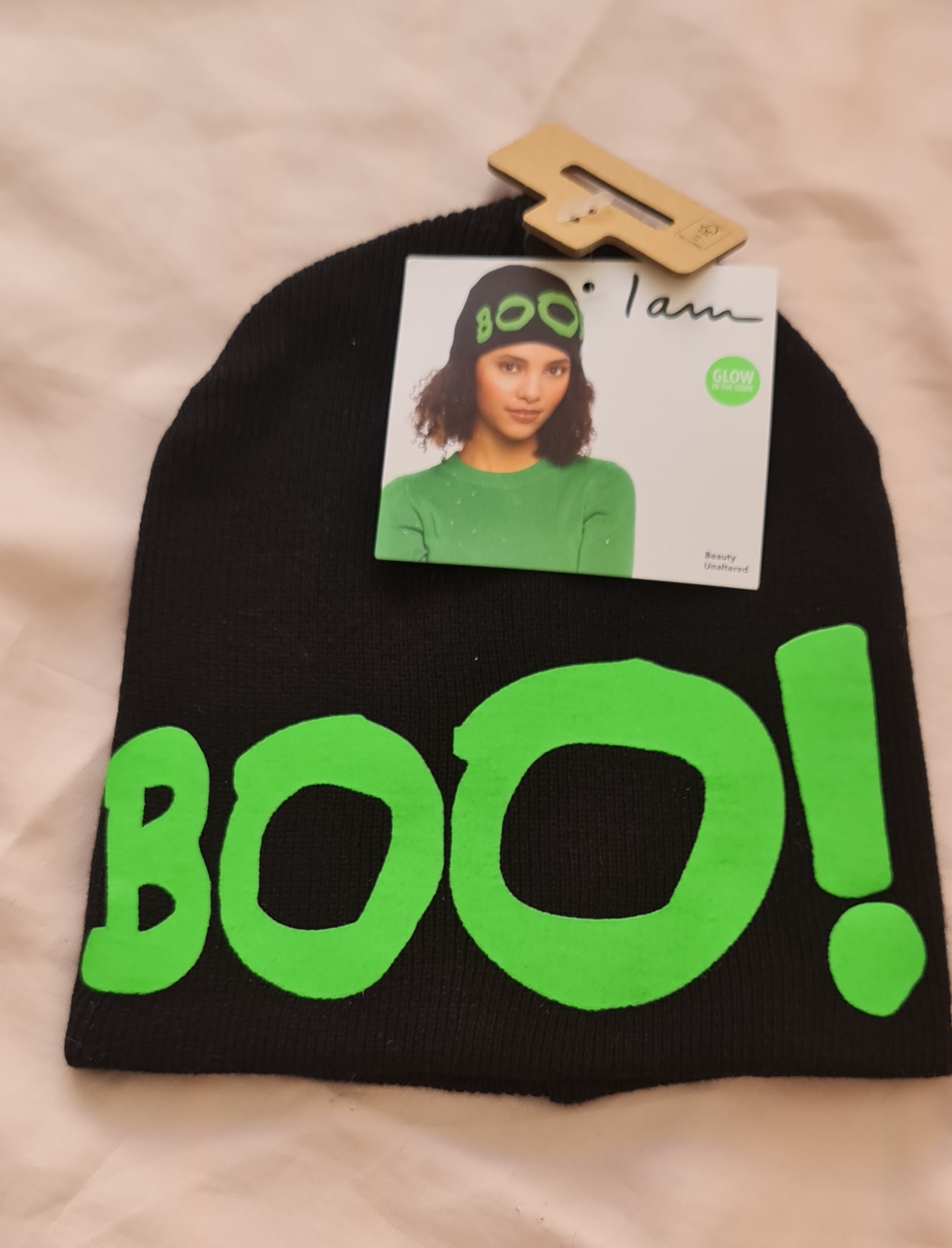 کلاه مشکی طرح boo که در شب بدلیل خاصیت فلوروسنت درخشندگی دارد